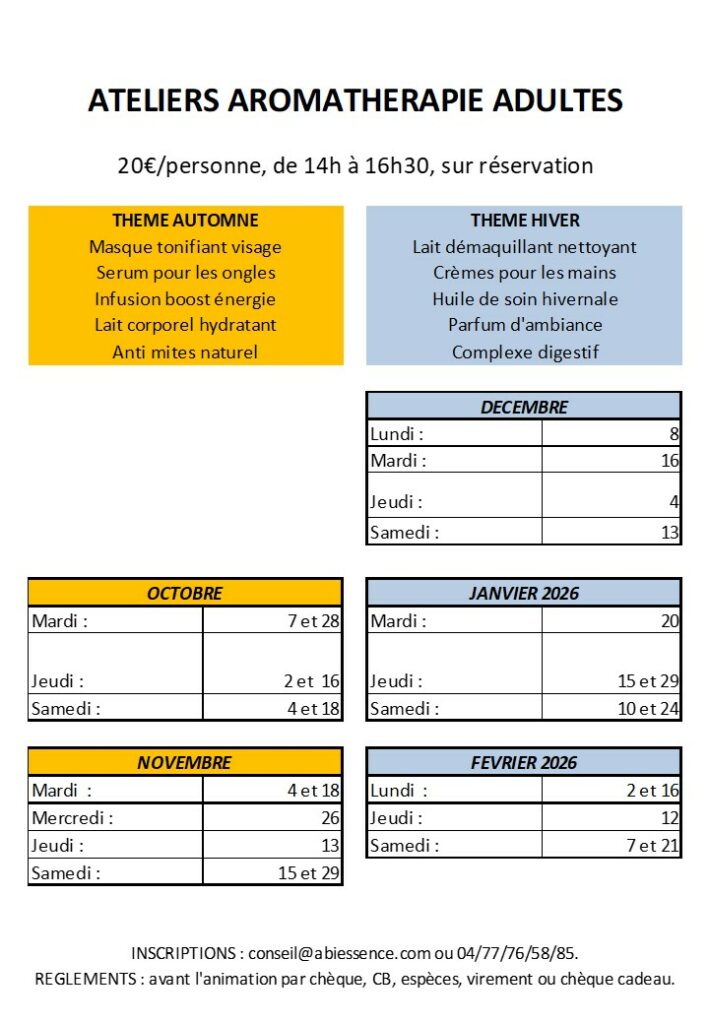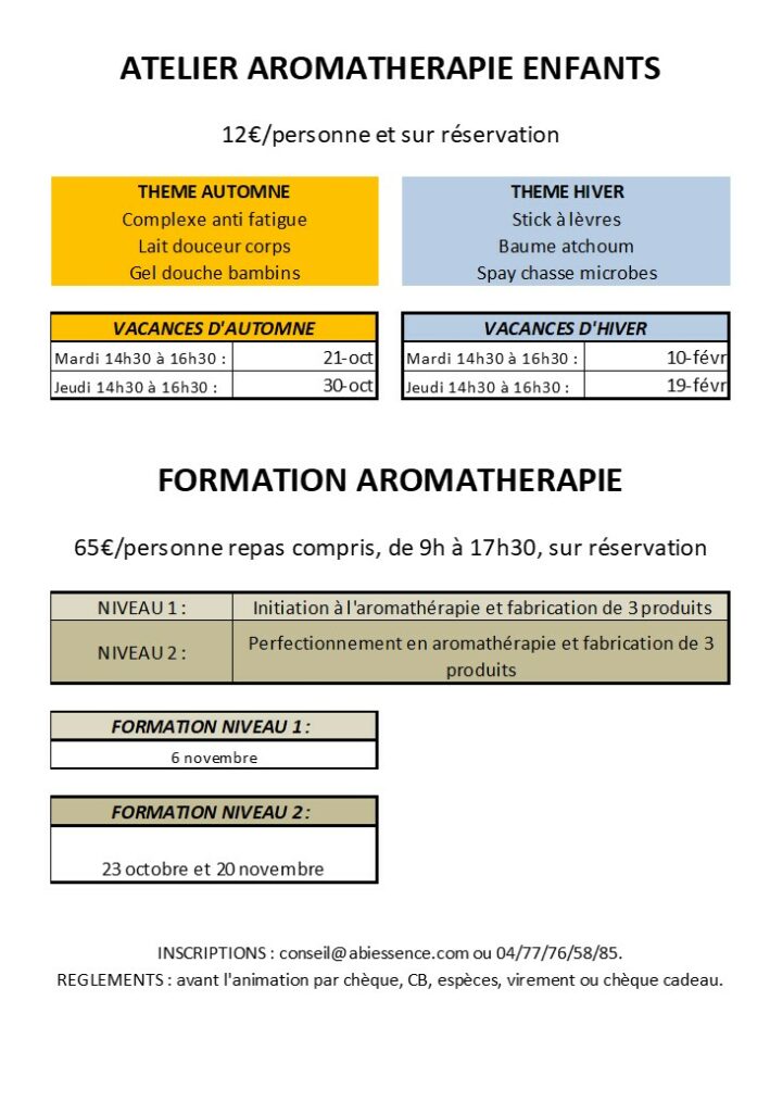 possibilité d’adapter la visite en fonction des âges, des formations, des difficultés… La visite peut être suivie d’un atelier de fabrication de produits cosmétiques type baume, roll’on…