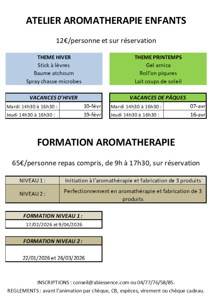 possibilité d’adapter la visite en fonction des âges, des formations, des difficultés… La visite peut être suivie d’un atelier de fabrication de produits cosmétiques type baume, roll’on…
